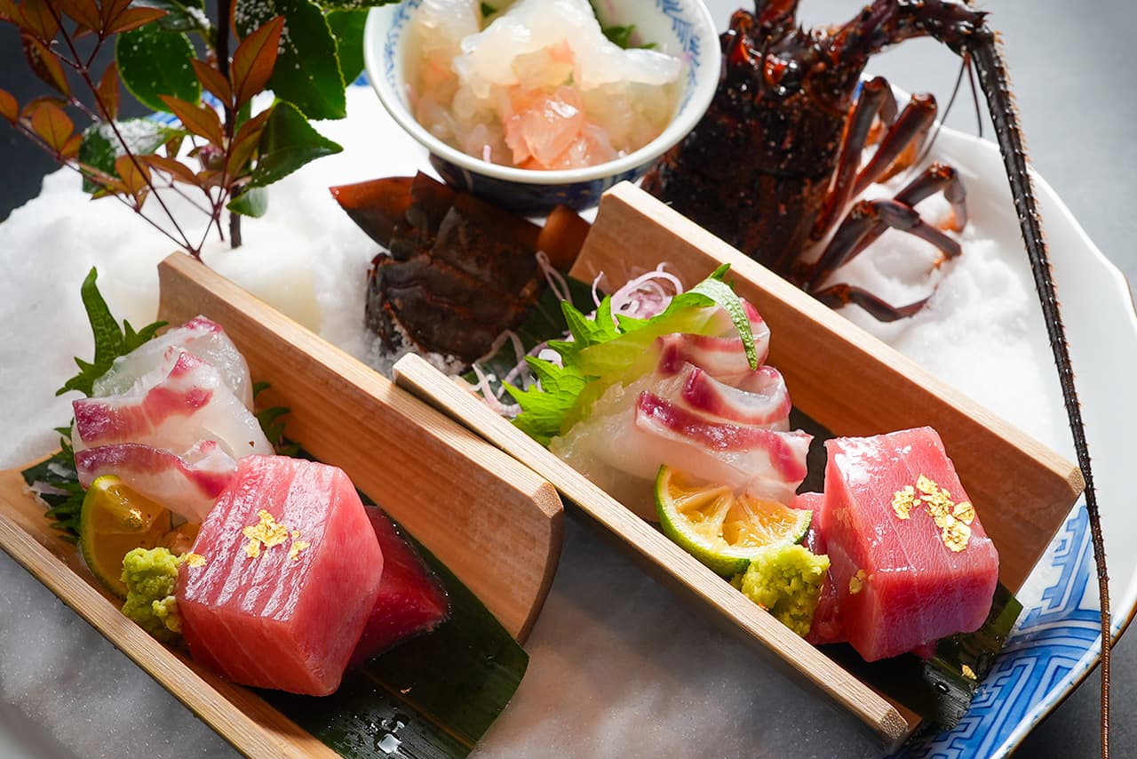 伊势龙虾、蓝鳍金枪鱼、天然红鲷。 佐餐配菜、土佐酱油、盐味橙醋。