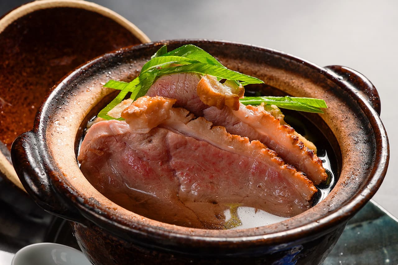 Roasted Duck loin, duck meatball, Kujo leeks, Shrimp Taro (Ebi-imo), and Yuzu Kosho pepper paste.