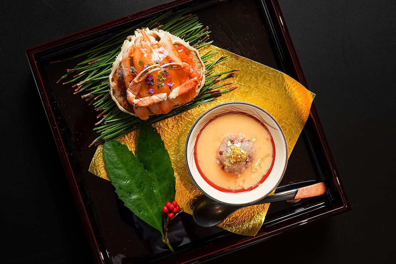 Steamed savory egg custard with red bean rice (Sekihan), topped with salted bonito entrails sauce, ginger, and gold leaf. Female Snow Crab (Kobako-gani) with vinegar gelee and baby shiso spikes.