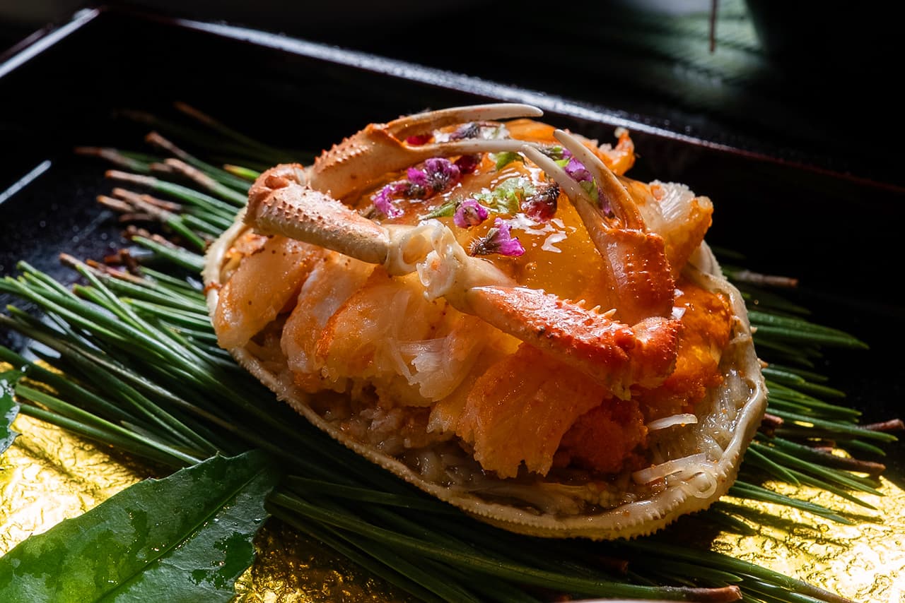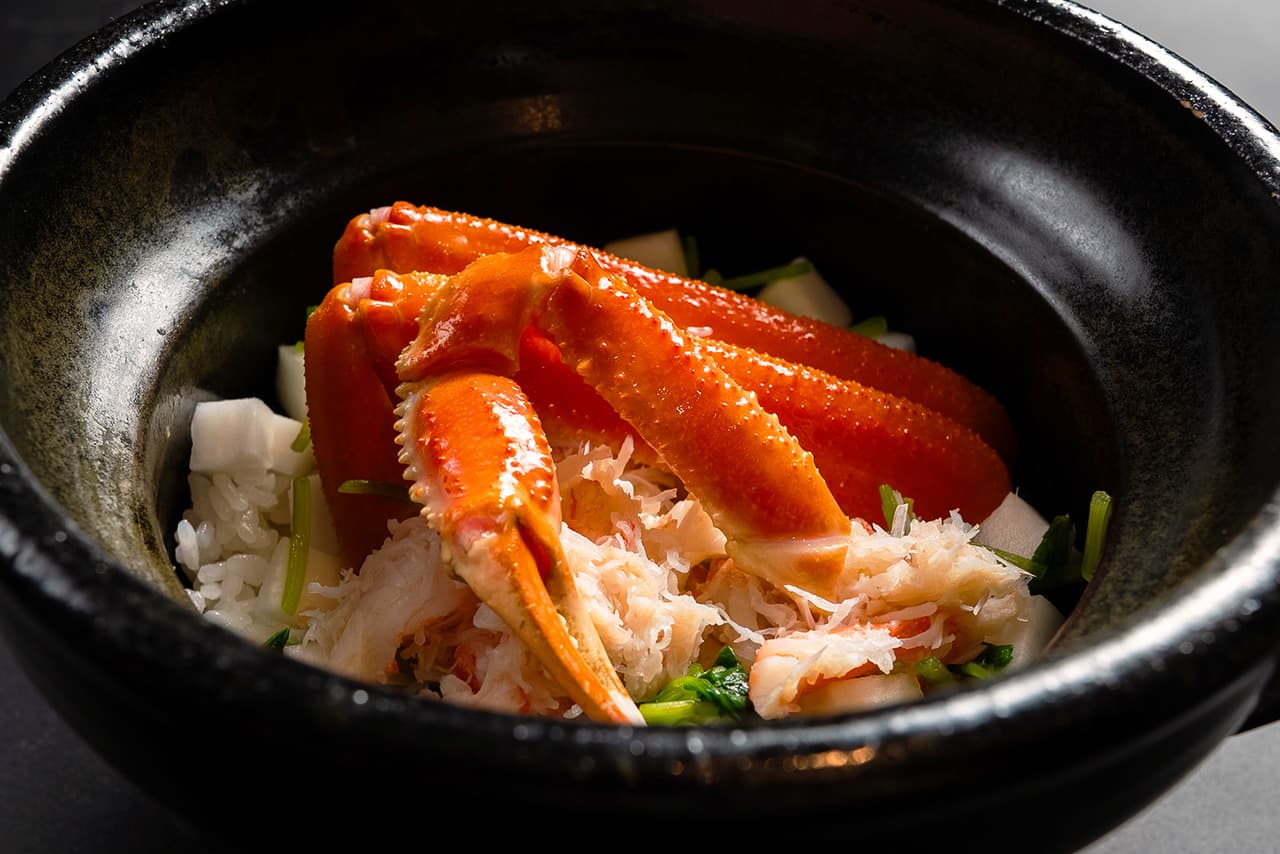Iron pot rice cooked with Snow Crab (Matsuba-gani) and Spring Turnip. Topped with Mitsuba parsley and diced Yuzu peel.